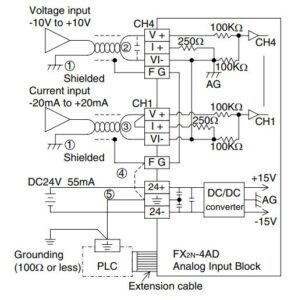 - Connect the FG (frame ground) terminal with the grounded terminal on the FX2N-4AD. (In CH1, there is no FG terminal. Use FG terminal of other channels.), if there is excessive electrical noise.